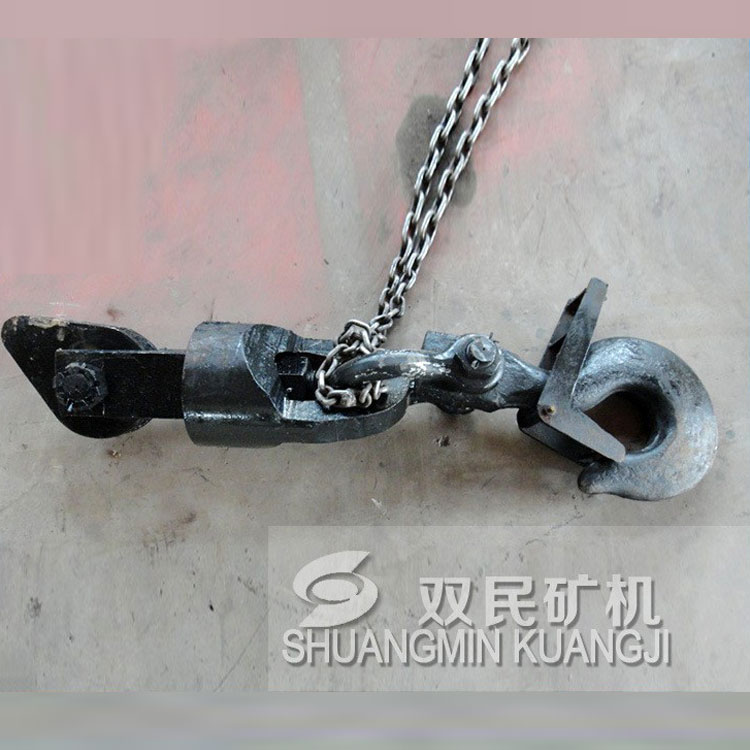 鉤頭及連接裝置,簡(jiǎn)稱為鉤頭裝置。 該產(chǎn)品結(jié)構(gòu)簡(jiǎn)單,使用性能單一。零件全部由鍛件加工而成,鋼絲繩連接采用了兩種型式,其中5t、7t采用不偏心護(hù)繩環(huán),板卡連接;9t