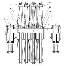 大部分天輪裝置為普通天輪結(jié)構(gòu),主要由軸承座、兩端軸承、天輪軸、游動(dòng)輪、固定輪、軸瓦、襯墊和卡箍等組成,如圖1所示。其中,左端輪子為固定輪,與天輪軸靠平鍵聯(lián)接;右側(cè) 3 個(gè)輪子為游動(dòng)輪,游動(dòng)輪與天輪軸之間有軸瓦,軸瓦與游動(dòng)輪轂之間靠高強(qiáng)度螺栓聯(lián)接;軸瓦內(nèi)部有儲(chǔ)油槽,通過(guò)潤(rùn)滑油脂來(lái)實(shí)現(xiàn)游動(dòng)輪與天輪軸靈活轉(zhuǎn)動(dòng)。當(dāng)每根鋼繩的線(xiàn)速度不完全相同時(shí),游動(dòng)輪與天輪軸之間可自由地相對(duì)轉(zhuǎn)動(dòng),防止鋼絲繩與襯墊之間產(chǎn)生滑動(dòng)摩擦,避免襯墊過(guò)度磨損,起到保護(hù)鋼絲繩的作用。zui 右側(cè)游動(dòng)輪的軸向定位通過(guò)安裝在天輪軸環(huán)形槽內(nèi)的兩半卡箍實(shí)現(xiàn),為了保證各游動(dòng)輪之間的間隙合適 (一般為0.2~0.5 mm),卡箍的厚度根據(jù)安裝實(shí)際情況進(jìn)行單配。該結(jié)構(gòu)的天輪裝置應(yīng)用較為廣泛,技術(shù)成熟。