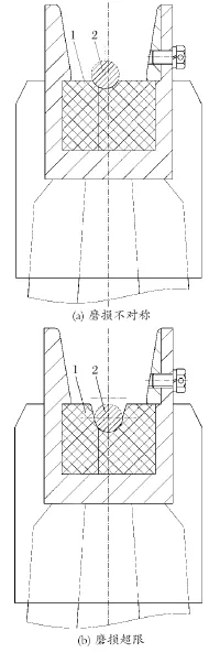 天輪裝置在返廠修復(fù)時(shí),天輪襯墊磨損一般出現(xiàn)2 種情況 (見圖 9),襯墊磨損左右不對稱和襯墊深度方向磨損超限。分析其原因:襯墊左右磨損不對稱是因?yàn)樘燧喲b置與主軸裝置不對中所致;襯墊磨損嚴(yán)重直接原因是鋼絲繩與襯墊發(fā)生了相對運(yùn)動(dòng),鋼絲繩打滑,輪緣偏擺較大也是原因之一。