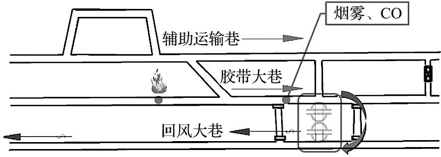 3.3.2 開拓大巷災(zāi)變條件下優(yōu)化方案 當(dāng)開拓大巷某一地點(diǎn)發(fā)生火災(zāi)等事故時(shí),由于明火存在火風(fēng)壓,在自然通風(fēng)條件下,明火與有毒有害氣體會(huì)隨風(fēng)流向下游區(qū)域蔓延。為準(zhǔn)確監(jiān)測(cè)災(zāi)變后的氣體特征,需要安裝煙霧和 CO 報(bào)警傳感器。當(dāng)監(jiān)測(cè)氣樣指標(biāo)超限時(shí),系統(tǒng)自動(dòng)打開膠回聯(lián)巷處的 2 道風(fēng)門,實(shí)現(xiàn)局部巷道的風(fēng)流短路,改變供風(fēng)方向,切斷向下游蔓延的氣體擴(kuò)散通道,從而達(dá)到保護(hù)下風(fēng)側(cè)作業(yè)人員生命安全的效果。風(fēng)流短路調(diào)控路線如圖5所示。