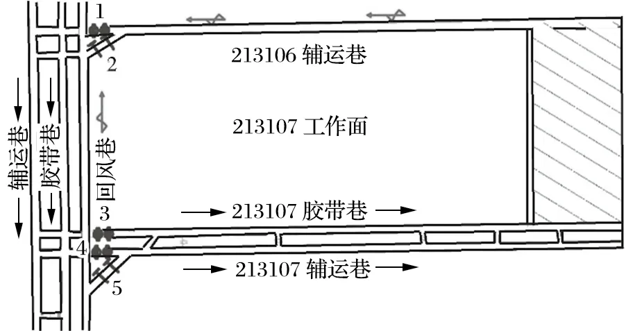 以213107 工作面為例,分別在 213106 輔運(yùn)巷安裝 2 道風(fēng)門,213107 膠帶巷安裝 1 道風(fēng)門,在 213107輔運(yùn)巷及?;馗靼惭b 1 道風(fēng)門。采煤工作面風(fēng)流優(yōu)化系統(tǒng)如圖4 所示。其中編號(hào) 1、3、4 為自吸風(fēng)門;編號(hào) 2、5 為自調(diào)節(jié)風(fēng)門。正常通風(fēng)時(shí),打開 2、3、4 等風(fēng)門,形成 U 形全負(fù)壓通風(fēng),關(guān)閉 1、5 風(fēng)門形成閉合回路;發(fā)生災(zāi)變需要反風(fēng)時(shí),則打開關(guān)閉的 1、5風(fēng)門,形成風(fēng)向逆流,由 1 號(hào)風(fēng)門進(jìn)風(fēng),5 號(hào)風(fēng)門回風(fēng),其余 2、3、4 號(hào)風(fēng)門關(guān)閉,可實(shí)現(xiàn)反風(fēng)效果。