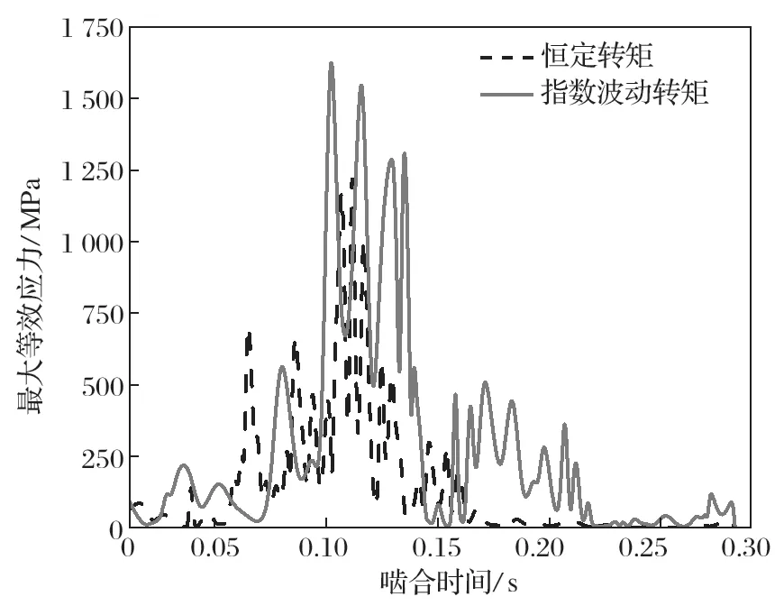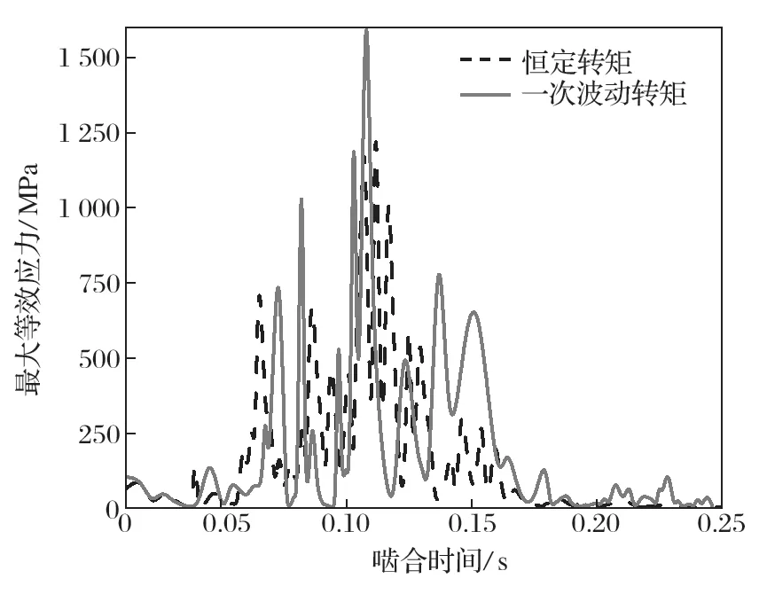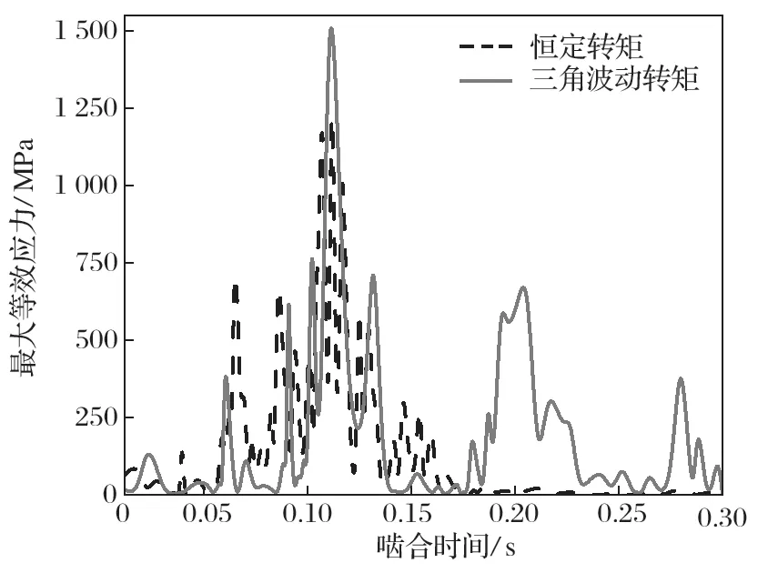 在有限元模型中,利用探針提取從動(dòng)輪一個(gè)齒面與一個(gè)齒根面的zui大等效應(yīng)力。觀察恒定轉(zhuǎn)矩的zui大等效應(yīng)力變化,當(dāng)齒輪嚙合時(shí)間到達(dá)0.11s 時(shí),位于從動(dòng)輪齒面與齒根面的zui大等效應(yīng)力達(dá)到zui大,zui大等效應(yīng)力處于齒根處;應(yīng)力的變化趨勢(shì)整體呈現(xiàn)出金字塔形;隨著同步齒輪嚙合的進(jìn)行,zui大等效應(yīng)力的幅值逐步升高;達(dá)到zui高點(diǎn)之后,應(yīng)力幅值又逐步降低,表明嚙合過(guò)程的結(jié)束。因?yàn)辇X輪嚙合過(guò)程中是單齒對(duì)接觸與兩齒對(duì)接觸交替出現(xiàn)形式,所以會(huì)出現(xiàn)zui大等效應(yīng)力的波動(dòng)。當(dāng)處于單齒對(duì)接觸時(shí),應(yīng)力波動(dòng)大,同時(shí)應(yīng)力值將達(dá)到zui大;在雙嚙合區(qū),其所受載荷與接觸壓力較平穩(wěn),受到?jīng)_擊較小,且應(yīng)力波動(dòng)較小。