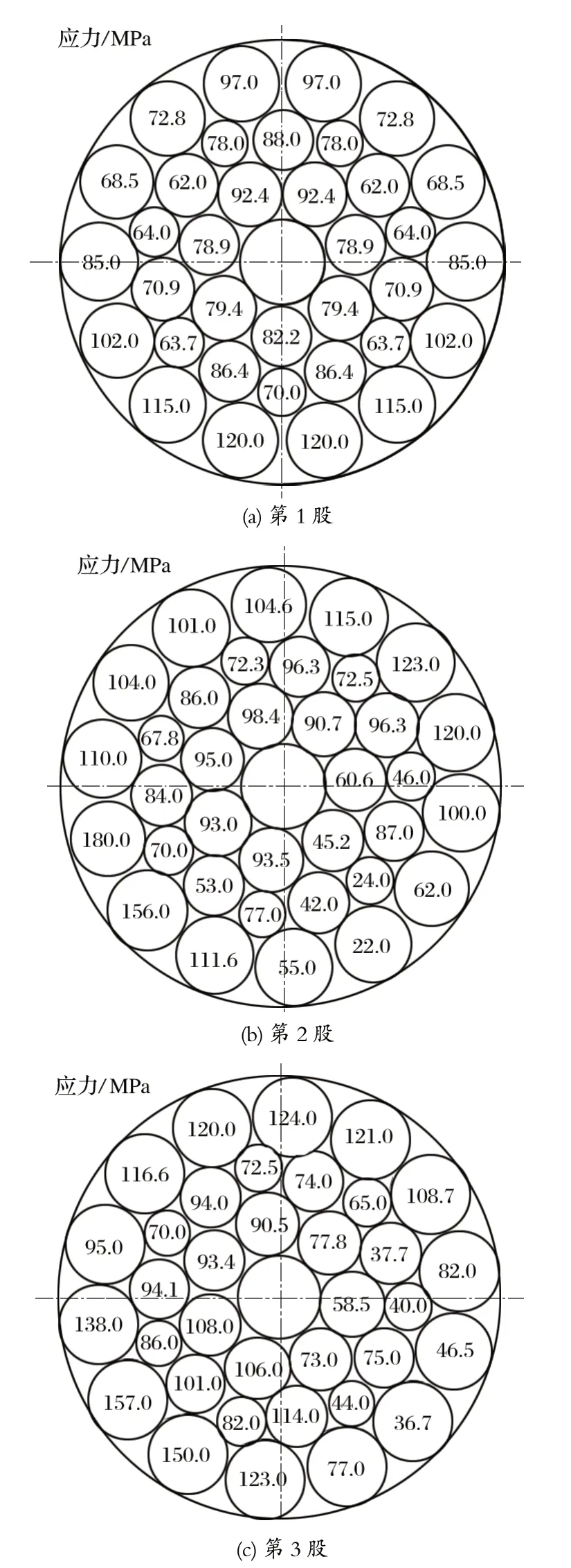 由圖4 可知,鋼絲繩第 1 至第 4 股內(nèi)第 1 層至第3 層鋼絲的總體應(yīng)力為 94.08、90.08、71.20 和 117.80 MPa。從圖中可以看出,鋼絲繩芯中 心軸的對稱軸位置處,第 1 股和第 4 股的鋼絲繩應(yīng)力是沿著左右方向?qū)ΨQ分布的;右同向捻和右交互捻鋼絲繩靠近繩芯的位置彎曲應(yīng)力較大。為了研究提升鋼絲繩的應(yīng)力分布及分布規(guī)律,采用有限元分析法建立鋼絲繩物理模型并進(jìn)行數(shù)值模擬,可以直觀得到鋼絲繩內(nèi)部以及繩股之間的應(yīng)力分布。